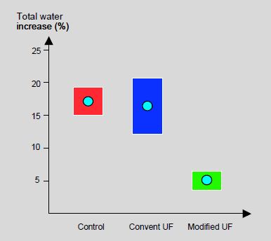 Figure 14.25: Fluid accumulation (total water) without ultrafiltration (control), with conventional ultrafiltration (UF) and with modified ultrafiltration (MUF) post-CPB in children [32]. MUF is significantly more effective. The rectangles represent standard deviations.