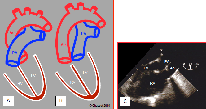 Figure 14.64: Diagram showing transposition of the great arteries (TGA). A: normal position of the aorta and pulmonary artery. B: position of vessels in TGA. C: long-axis view of the aorta and PA, which appear parallel instead of crossing at 45°. The anatomically right ventricle is hypertrophied since it acts as a systemic ventricle (sub-aortic).