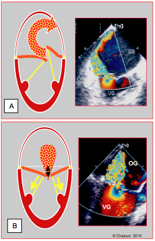 - La compression pariétale par le stabilisateur restreint le remplissage diastolique ; la paroi concernée devient rigide et immobile, bien que souvent s’épaississant encore; les flux auriculo-ventriculaires sont de type restrictifs.