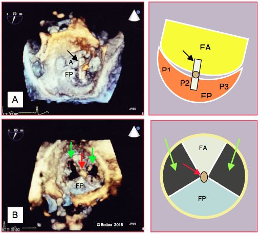 La position verticale maintenue par des compresses et par le stabilisateur de l'anastomose a pour effet de plier le cœur au niveau du sillon auriculo-ventriculaire et de provoquer une distorsion de l'anneau mitral et de l'anneau tricuspidien. L'anneau est déformé à telle enseigne que la valve fuit; une IM modérée-à-sévère se développe chez environ 60% des malades pendant ces manoeuvres (Vidéo) [4]. L’apparition d’une IM sévère est plus fréquente chez les malades qui souffrent déjà d’une régurgitation mitrale modérée. La reconstruction tridimensionnelle montre que le déplacement mécanique du cœur tord l'anneau mitral, particulièrement lors d'anastomose sur la face latérale (artère circonflexe) [4]. Avec une ventouse qui suspend le VG par l'apex, la déformation de l'anneau mitral est moins brutale, mais il perd sa forme en selle lors des anastomoses sur la circonflexe et sur la coronaire droite (IVP), ce qui aggrave l'IM (voir Figure 10.6) [17].