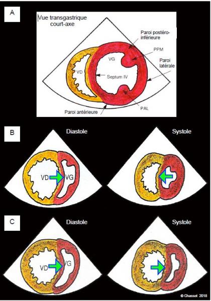 - La bascule du septum interventriculaire dans le VG en diastole en cas de dilatation du VD (défaillance et/ou surcharge de volume) ou en diastole et systole en cas de surcharge de pression du VD perturbe le remplissage et l’éjection du VG, dont le débit baisse. D’autre part, les modifications de la position du septum ventriculaire ampute le VD de l’aide fonctionnelle du VG à son éjection.