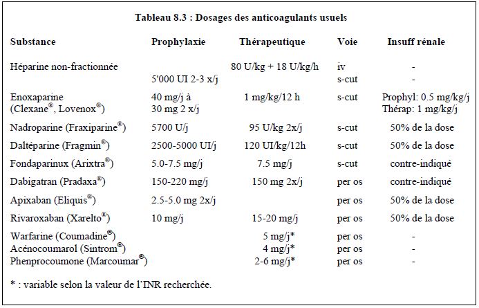 Les principales données concernant les anticoagulants sont résumées dans les Tableaux 8.1, 8.2A et 8.2B. Les dosages et l’adaptation des doses à l’insuffisance rénale figurent dans le Tableau 8.3. Les données concernant les antiplaquettaires sont disponibles dans le Chapitre 29 (Chapitre 29) et accessoirement dans le Chapitre 3 (Antiplaquettaires). Un résumé de ces données figure dans les Tableaux 8.11 et 8.12.
