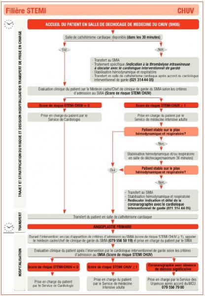Figure 9.29D : Algorithme CHUV de prise en charge hospitalière du malade souffrant d'un syndrome coronarien aigu : infarctus STEMI [28].