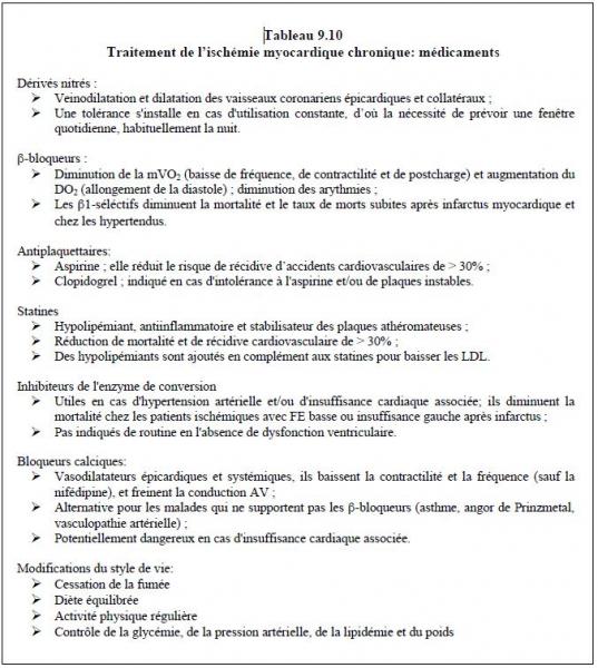 - Béta-bloqueur cardiosélectif (métoprolol, carvédilol, bisoprolol): indiqué dans les premières 24 heures, mais pas avant que le patient ne soit stabilisé, sauf en cas de tachyarythmies; contre-indications: fonction ventriculaire déficiente, vasospasme coronarien, abus de cocaïne.