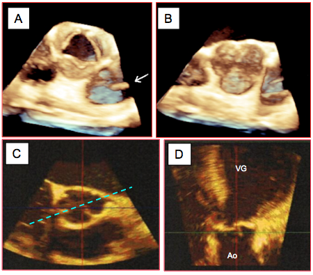 Dans le premier cas, il s’agit de la maladie annulo-ectasiante de l’aorte ascendante: la dilatation de l’anneau et de la jonction sino-tubulaire tend les bords libres des cuspides, qui sont normales, et les empèche de coapter proprement [2]. Cette affection relève de la médianécrose cystique de l’aorte, isolée ou associée au syndrome de Marfan, de la dégénérescence dilatative de l’aorte liée à l’âge (anévrysme), ou de syndromes inflammatoires systémiques (spondylite ankylosante, syndrome de Reiter ou de Behçet, aortite syphilitique, etc). Enfin, le flap intimal d’une dissection aortique de type A peut déstabiliser l’appareil valvulaire ou prolaber à travers la valve en diastole (Vidéo).