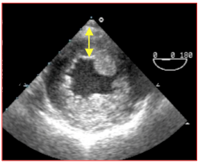 Figure 26.107 : Hypertrophie concentrique du VG dans un cas de sténose aortique serrée. L'épaisseur de la paroi postérieure est de 1.5 cm en diastole. La cavité du VG est très rétrécie.