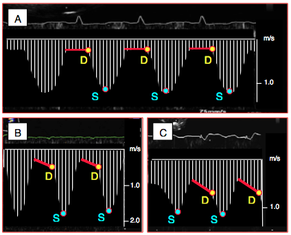 - Augmentation du diamètre de la VCI, de la VCS et du sinus coronaire ; présence de flux veineux rétrograde important en systole (IT) et pendant la contraction auriculaire (perte de compliance du VD) dans la VCI et les veines sus-hépatiques.