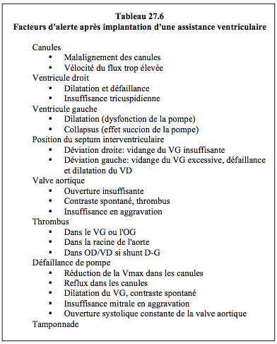| Caractéristiques de la défaillance du VG - Dilatation et sphéricisation du VG (Dtd > 4.0 cm/m2, Dts > 2.5 cm/m2) - Hypokinésie généralisée, paroi amincie - Faible amplitude des mouvements mitraux, IM restrictive (Vmax diminuée) - FAC < 0.25, FE < 0.35, Vcf < 0.5, indice de Tei > 0.5 - S’ (Doppler tissulaire) ≤ 5.0 cm/s - Déformation longitudinale moyenne < 12% - Durée jusqu’à la Vmax du flux aortique > 35% de la durée d'éjection Caractéristiques de la défaillance du VD - Dilatation du VD (surface identique ou plus grande que celle du VG en 4-cavités) - Hypokinésie sévère de la paroi libre - Bombement du septum interventriculaire dans le VG - IT modérée à sévère, Vmax diminuée - Bombement du septum interauriculaire dans l’OG - FAC < 0.3, indice de Tei > 0.5, TAPSE < 15 mm - S’ (Doppler tissulaire) ≤ 6.0 cm/s - Déformation longitudinale < 15% Caractéristiques de l’insuffisance diastolique sévère - Dilatation de l’OG (> 34 mL/m2) - Propagation du flux mitral < 40 cm/s - Décélération de la composante E du flux mitral < 150 msec - Rapport E/E’ > 14 - Durée Ar –Am > 40 ms |
