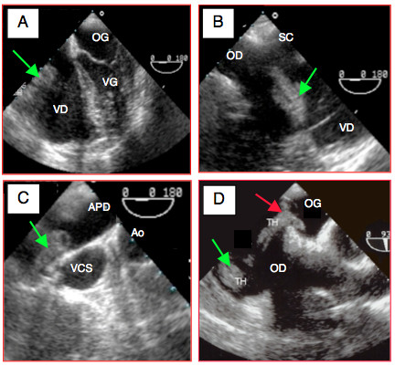 Les principales pathologies rencontrées en urgences sont l’ischémie coronarienne et ses complications (voir Complications de l’ischémie), l’insuffisance mitrale et aortique aiguës sur rupture de l’appareil sous-valvulaire ou sur endocardite (voir Chapitre 26, Endocardite), la dissection aortique et la rupture d’anévrysme thoracique (voir Dissection, Anévrysme et Traumatisme aortique), la tamponnade (voir Tamponnade), l'assistance circulatoire (voir Chapitre 12, Assistance ventriculaire), l'arrêt cardiaque, la transplantation, le traumatisme thoracique et l’embolie pulmonaire. Nous n’aborderons ici que ces trois derniers sujets. La plupart des autres situations sont traitées au Chapitre 25, Instabilité hémodynamique. En plus de cette liste, l’ETO est extrêmement utile pour le diagnostic différentiel et la gestion de toutes les instabilités hémodynamique sévères ou inexpliquées.
