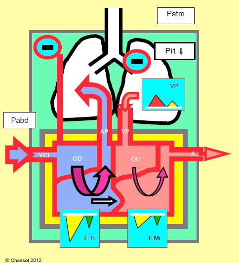 - La contention péricardique prévient l'augmentation de volume du VD et joue un rôle dans le maintien de sa fonction systolique, comme le prouve la baisse de ses performances éjectionnelles dès l'ouverture du péricarde [5]. Elle facilite également la participation de la contraction gauche à l'éjection droite (interdépendance ventriculaire).